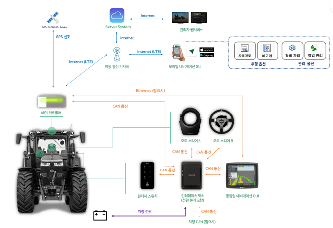 제품영상이나 소개에서도 알 수 있듯이 플루바오토는 총 4가지 구성품으로 이루어져 있습니다. 메인컨트롤러, 인터페이스 박스, 원터치 스위치 박스, 스티어링으로 구성되어 있고요. 메인컨트롤러 같은 경우 개발자들 사이에서는 단말기라고 부르고 있습니다. GPS를 수신해서 차량자세 측정, 부착되어 있는 농기계의 위치도 알려주고 경로를 따라가기 위한 명령을 생성합니다. 인터페이스 박스는 구성품간의 통신을 지원하기 위한 허브 장치로 전원 연결, 외부 단자 등을 연결할 수 있는 장비입니다. 원터치 스위치 박스는 작은 리모컨 형태로 자율주행을 제어하기 위한 장치에요. 원터치 스위치를 통해 직관적으로 자율주행을 조작할 수 있죠. 스티어링은 농기계에 따라 2가지 형태로 생선된 주행경로를 추종하기 위해 필요합니다. 기존 농기계의 핸들에 부착 또는 교체하여 농기계의 스티어링을 대체하고 있어요. 농민분들이 트랙터 한대만 사용하는게 아니라 보통 트랙터, 이앙기, 콤바인 등 다양한 농기계를 사용중인데요. 플루바오토 키트를 구매했다면 메인컨트롤러를 다른 농기계에 부착 후 나머지 구성품만 구매해 다른 농기계에도 사용이 가능합니다.