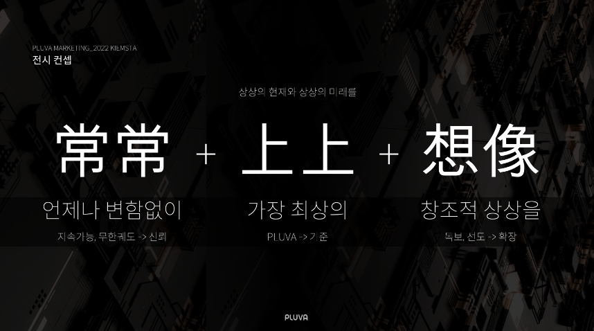 어떠한 기획이든 의도가 있어요. 그 의도를 보여주는 것이 바로 컨셉이죠. 명확한 컨셉을 가지는 것이 첫 스텝이였습니다. 킥오프를 시작으로 “플루바는 무엇을 해야할까 ?” 라는 것이 주요한 안건이였어요. 전시 의도 즉, ”플루바”라는 브랜드를 알리자. 인식시키자. 라는 목표를 세우고 BX 관점에서 어떤 경험을 그려 나갈지 이야기를 나눴습니다.🤷♀️ 첫 기획은 긴트가 농산업군 기술에 국한된 것이 아닌 스마트 농업이라는 타이틀에 걸맞게 “[농업의 상상] 무한한 가능성을 가진 플루바라는 미래농업문화를 보여 모두에게 인사하자”였습니다. 그렇게 우리는 세가지 상상을 하게 됩니다. 상상(常常)+상상(上上)+상상(想像) 첫 상상 : 언제나 변함없는 플루바의 신뢰를, 두번째 상상 : 가장 최상의 기술을 보유한 플루바의 기준을, 세번째 상상 : 창조적 상상으로 선도하는 플루바의 확장을 한마디로 요약하면 현재의 플루바부터 미래의 플루바까지 경험을 그려나가고 싶었습니다.